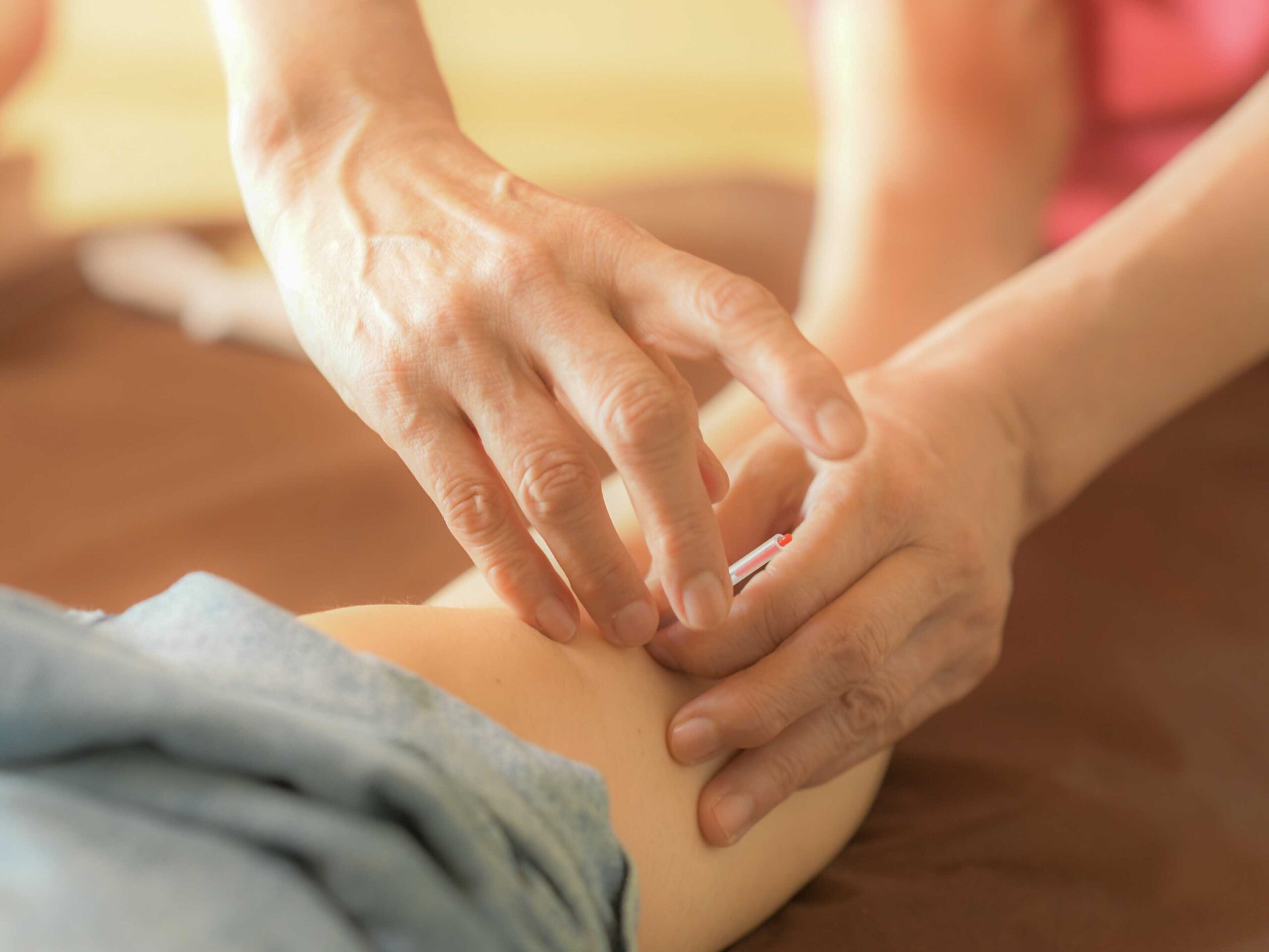とても細い鍼を、痛くない程度に皮膚に刺します。ツボを刺激して血流を良くしたり、体の動きを整えたりします。鍼を刺さないやり方もございますので、ご相談ください。
